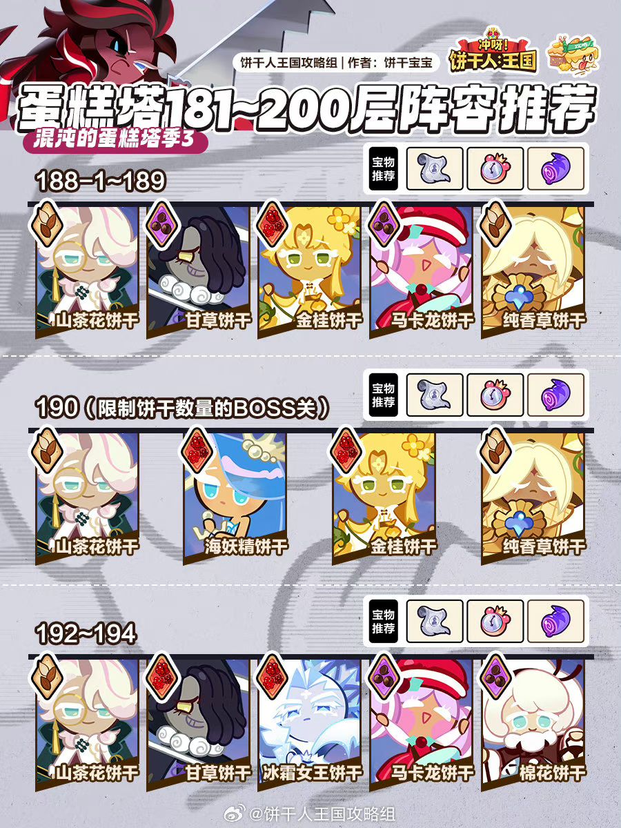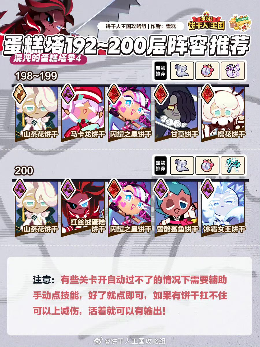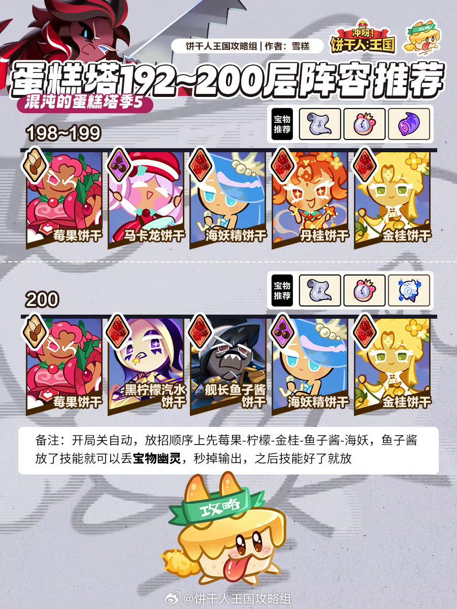 这期蛋糕塔199好过200有点难,因为取消了防御饼干上不了莓果,所以试了好多次才弄明白怎么过!说一下配料哈,丹桂攻击攻速会心,棉花糖全减伤,冰霜减cd必须19左右黑咖啡减cd攻击,查尔斯减伤攻击,宝物还是秘籍,时钟,弹弓。
