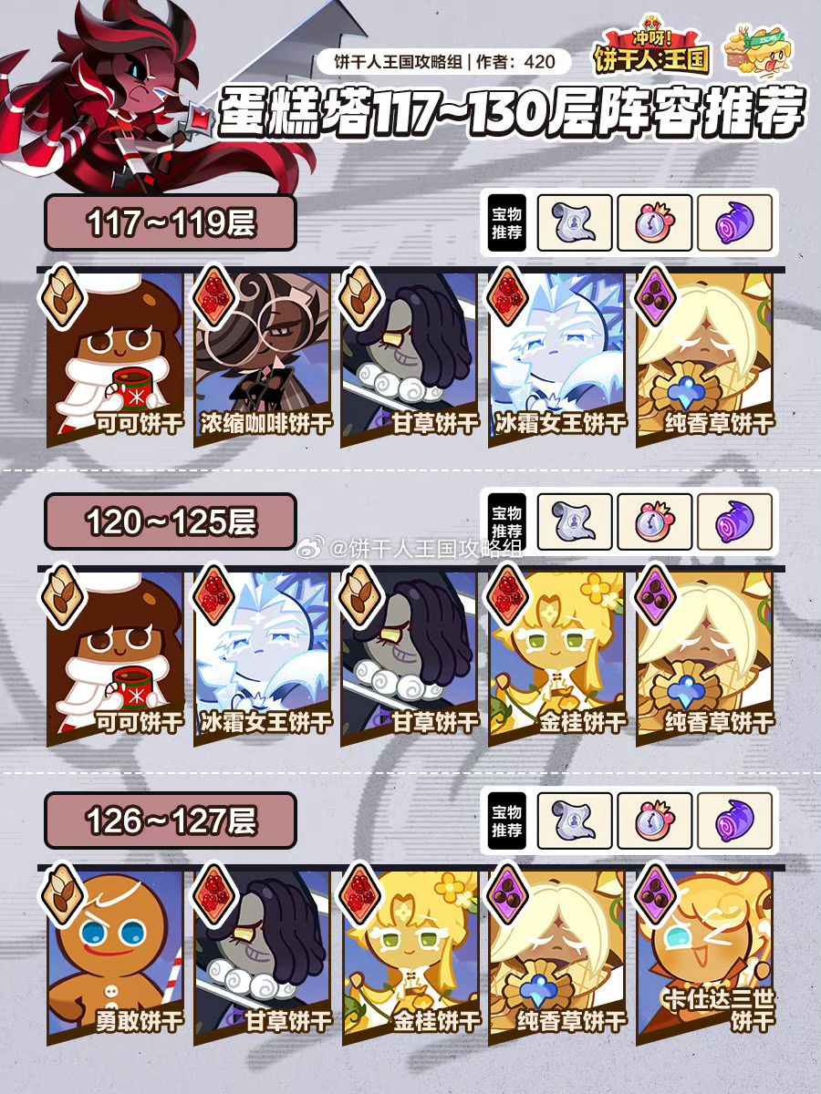 蛋糕塔117~130层阵容推荐,100层后蛋糕塔关卡难度比较高,打不过可以尝试手动操作卡时间放技能。可可饼干可以用草莓可丽饼饼干替换,棉花饼干配料可以用全冷却,狼人饼干可以换成配料为全冷却的红丝绒蛋糕饼干。 作者:420