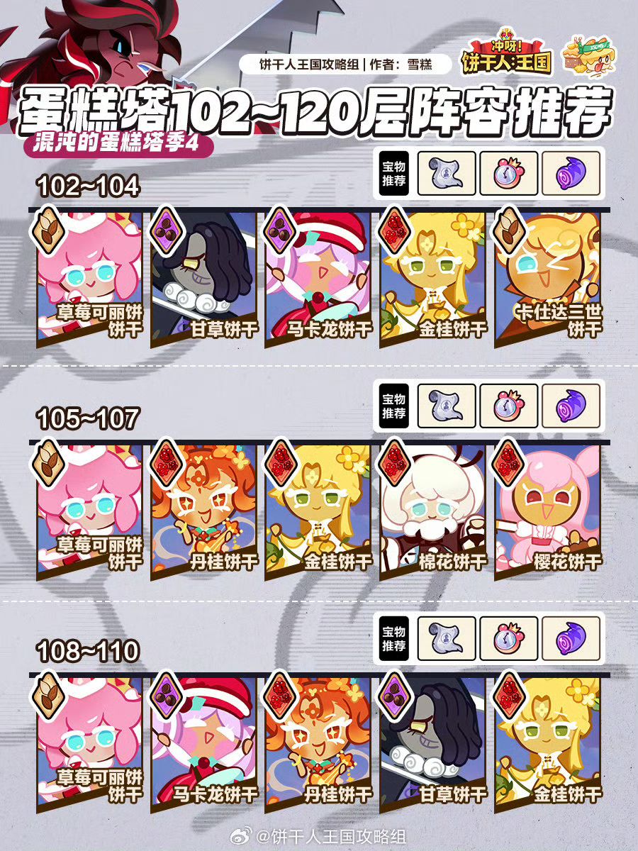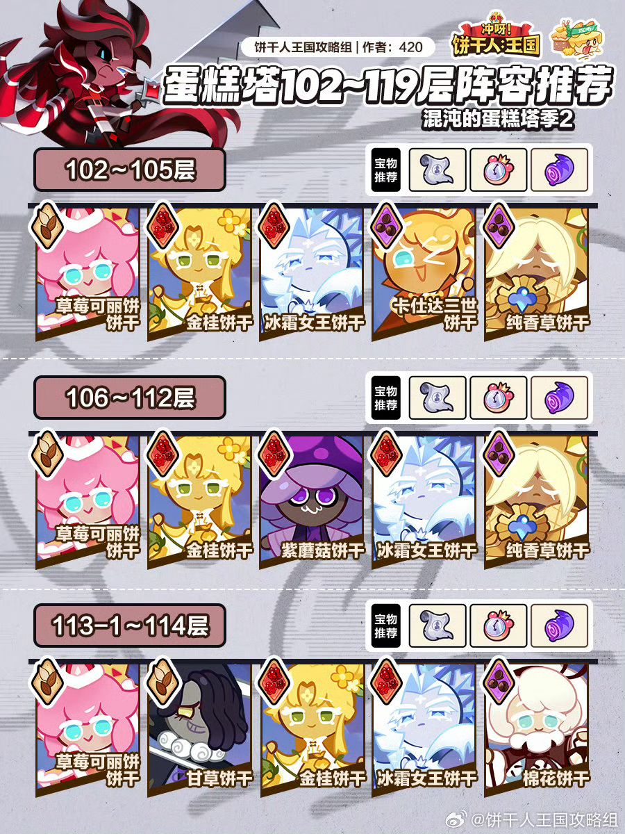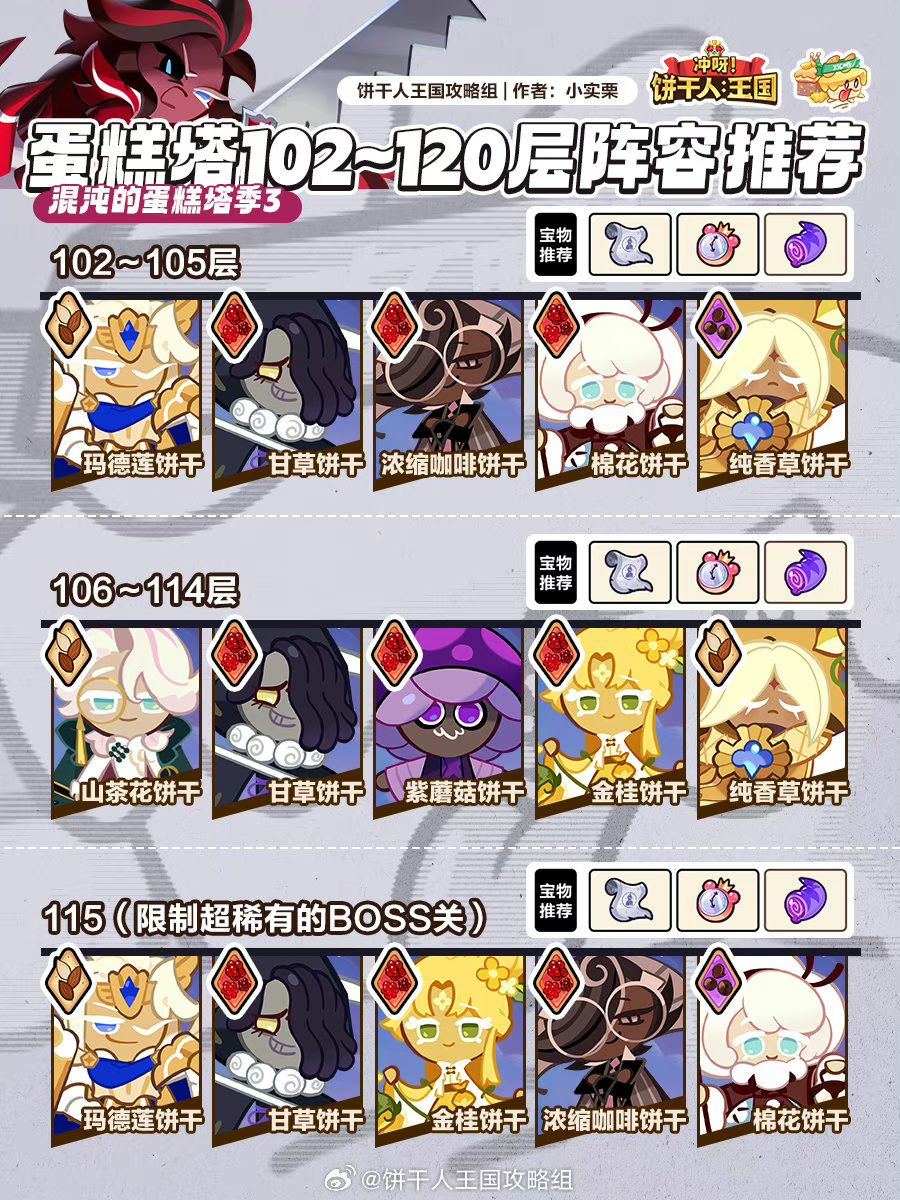 蛋糕塔第三季,第102~120层阵容推荐,注意:阵容不是固定,大家可以根据自己已有的饼干选择上场 作者:小实栗