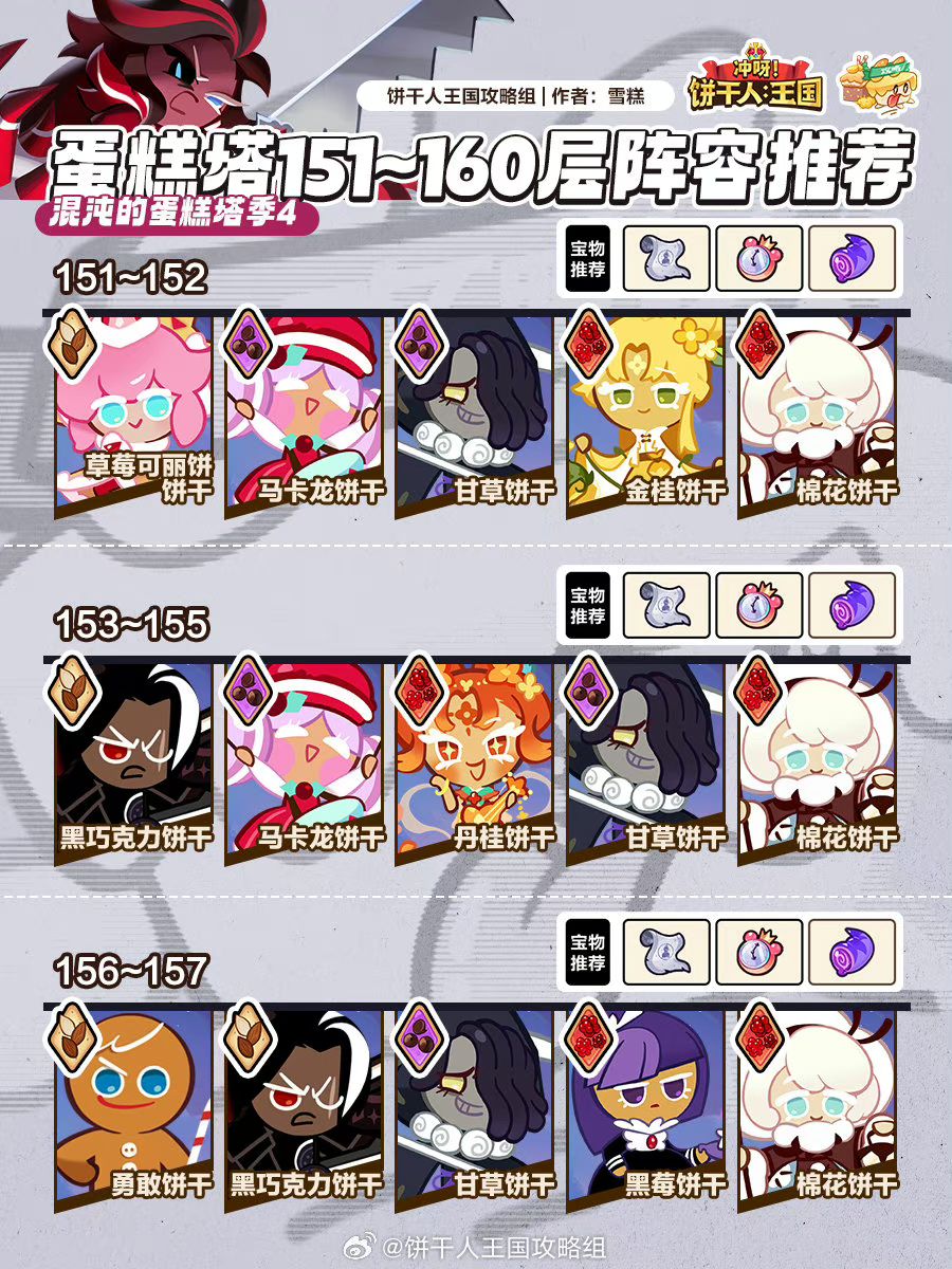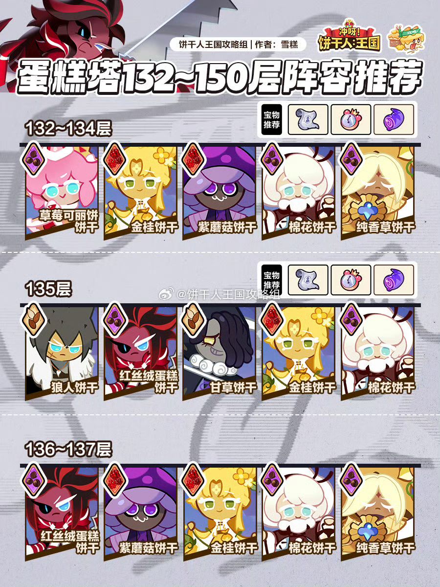 蛋糕塔132~150层阵容推荐,该层难度比较大,大多关卡需手动操作卡时间放技能。红丝绒饼干可以换成全抗伤狼人饼干,阵容需要抗伤地标,如若没有需要给饼干适当贴抗伤配料 作者:雪糕