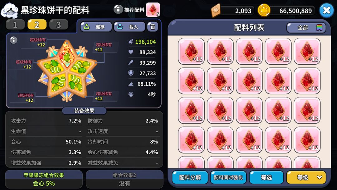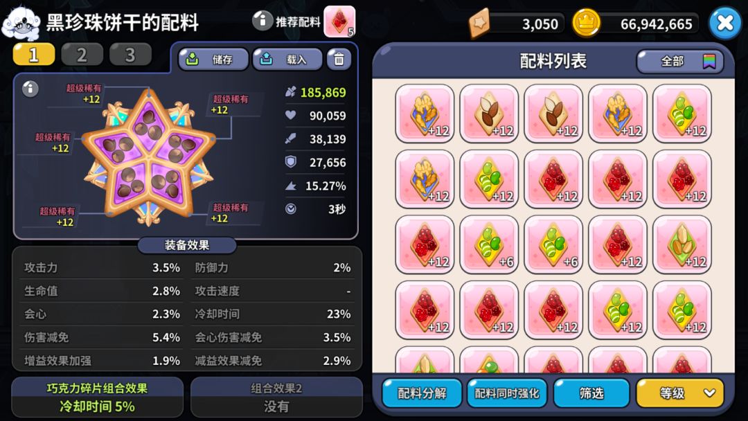 👍第一套👍我的配料搭配思路: 👌首先我们注意一点。它冷却可以压缩。 开局技能4秒。而我们卡22.30%上以上的冷却时,技能冷却就可以卡到3秒!所以冷却必不可少!!! 👌其次黑珍珠是奇袭饼干。 什么意思呢?就是后排啊!后排一般是输出,并看会心的,比如我们经典的德古拉,他单伤百分之1063.2!加上会心暴击一下,再来个破盾英雄和宝物,直接干翻boss!好……扯远了,这说明啥,这说明后排吃伤害!所以