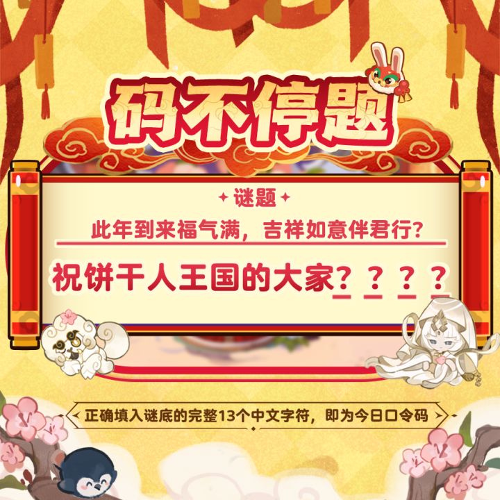 春节期间,将连续7天在各大官号社区发起「彩方猜猜乐」活动并放出谜语,谜底对应当日「彩虹方块*666」口令码,连续7天累计可收获彩虹方块*6216,欢迎饼干朋友们参与竞猜! 【谜语】此年到来福气满,吉祥如意伴君行?【谜面】祝饼干人王国的大家????