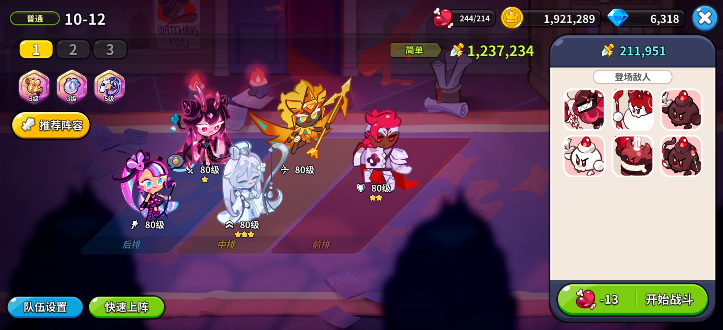 必须上冰锥雪怪和粉雪饼干,冰锥雪怪我好歹还把等级技能脆饼配件都升完了,粉雪资源不够也不想浪费在这就简单上了配件和脆饼,进去基本立马暴毙,我试了好几次不同饼干,boss两千万的血,我最多也就打五六百万,想伤害高饼干就容易暴毙,难道只能耗时间攒饼干碎片升星了吗?