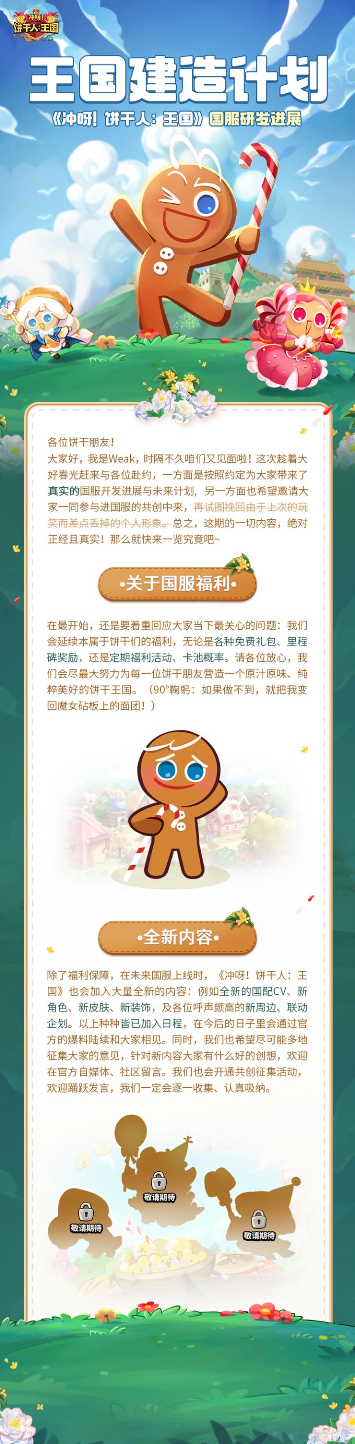 大家好,我是Weak!为了遵守与各位的约定,也为了试图挽回自己的形象(小声),我携带一份真实的研发进展,趁着大好春光向各位振臂赶来了—— 除了进展同步外,为了收集更多饼干朋友的想法,我们将开启「王国共创邀请」「王国实验室」两条通道,邀请饼干朋友对国服全新内容进行共创与调优。今后,请与我们一同打造繁荣的饼干王国吧!