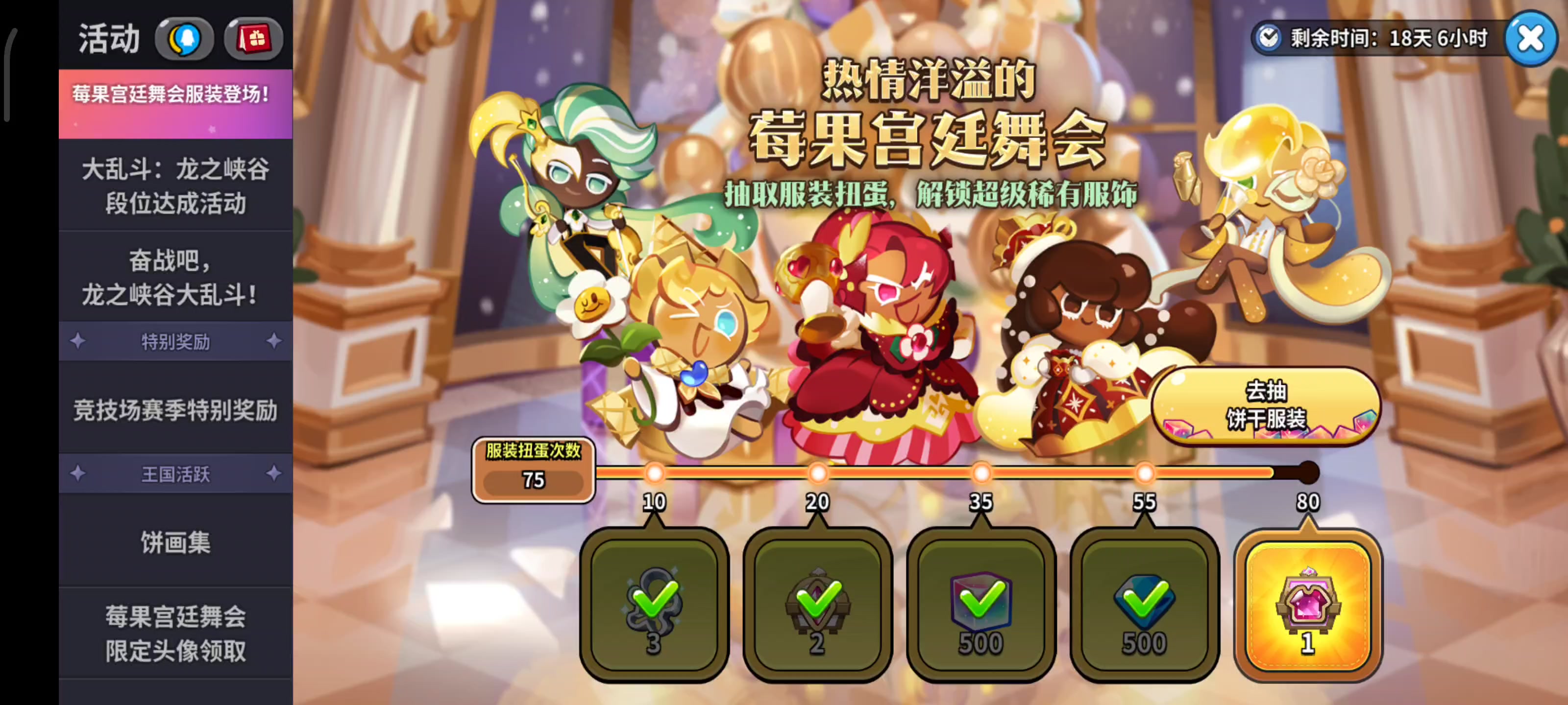 「莓果王国的宴会,欢迎所有饼干!」 >>活动形式:特别服装扭蛋 >>活动时间:4月27日00:00:00-5月15日23:59:59 >>开启条件:通关2-13,并完成蒙布朗饼干发布的任务 ✦服装鉴赏:https://www.taptap.cn/moment/532221059387100452