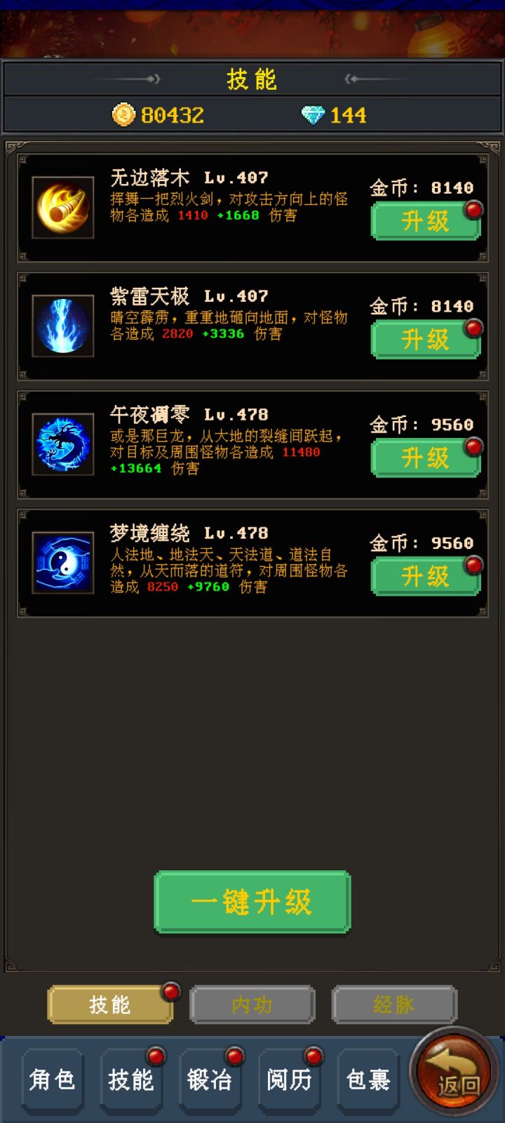 但是本作更甚,在固定挂机这一点上,它采取了各种功能的长摁升级,与一键装备和一键功法升级等设计,可以说让玩家所需要操作的功能更为局限,也就等于自废可玩内容从而大幅度抬高挂机性。