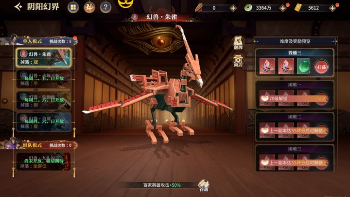 阴阳幻界-攻略篇界面展示玩法规则 幻兽“赤练王蛇”每周二、五、日开启幻兽“铁蜘蛛”每周三、六、日开启幻兽“白虎”每周四、六、日开启 每种幻兽产出装备部位不同,所以要合理安排时间攻略这个玩法哦 额外获取次可以靠VIP等级来增加 开启条件是受人物主角等级和当前难度评分等级控制的 玩法产出 普通产出,橙装和红1星-2星级别装备、装备强化材料、幻玉髓困难产出,红3星—