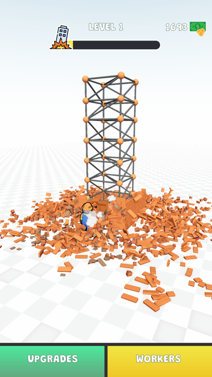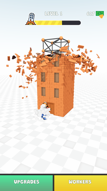 Tap as fast as possible to demolish the building. Buy new workers to help you and destroy all the buildings.