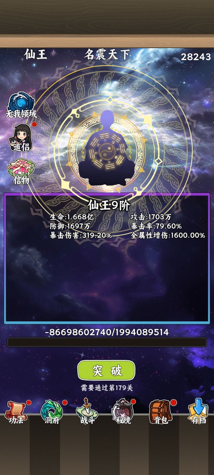 没有修改,纯bug突破失败之后发现突破界面没有消失,还能继续点,然后我就一直点,就一直升,到最后点不动了,重启游戏,发现已经仙王了,修完也直接被扣到了负数