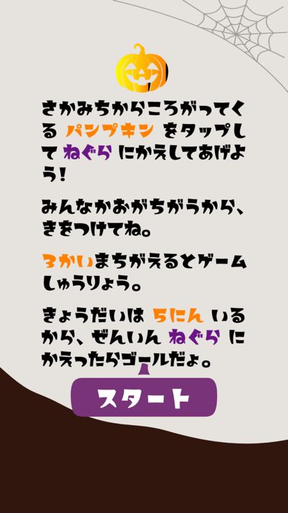 転がってくるパンプキン(カボチャ)をタップして兄弟5人をねぐらに返してあげよう!
