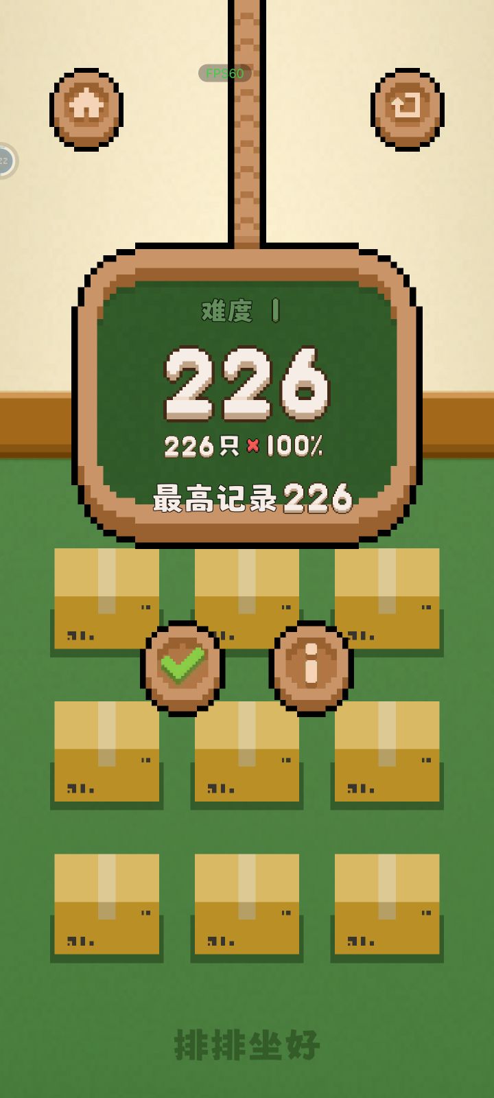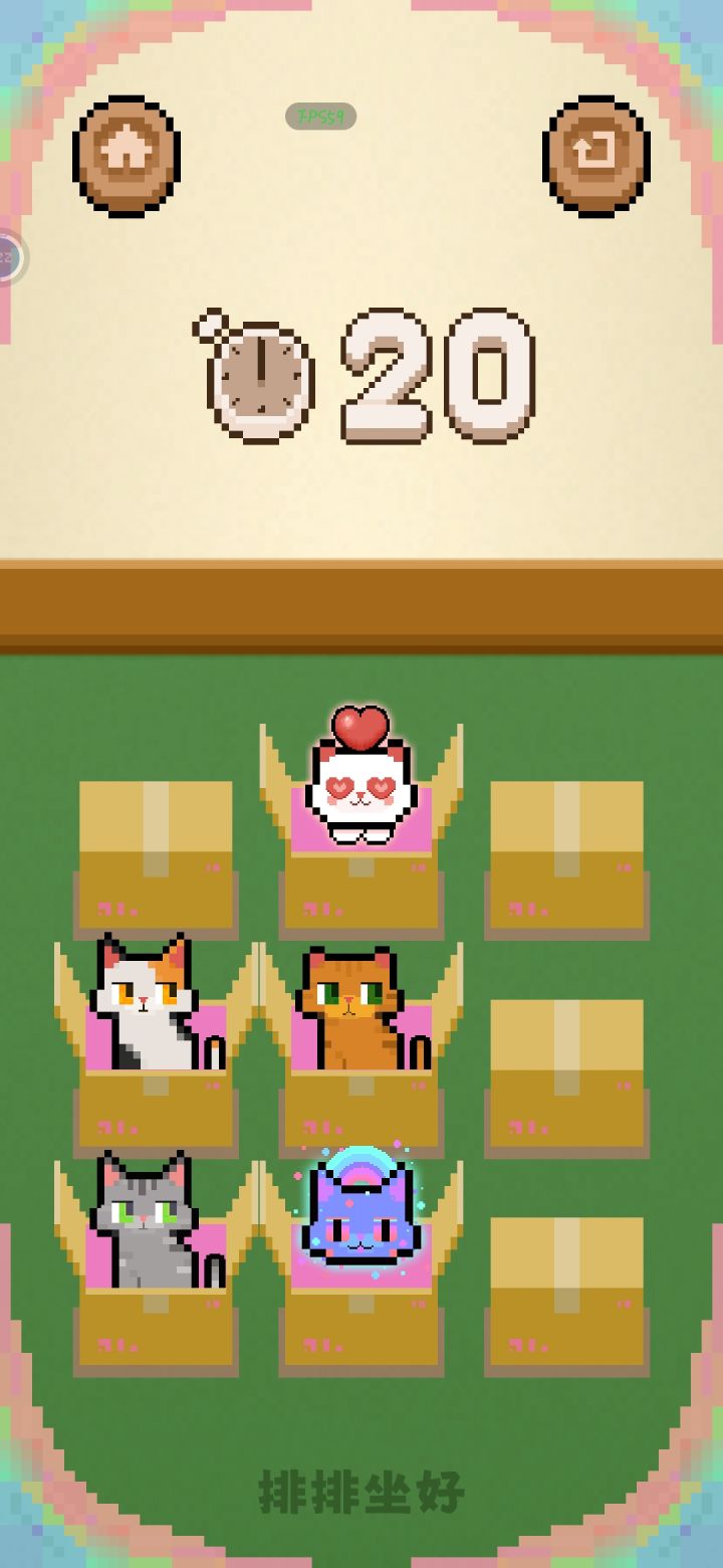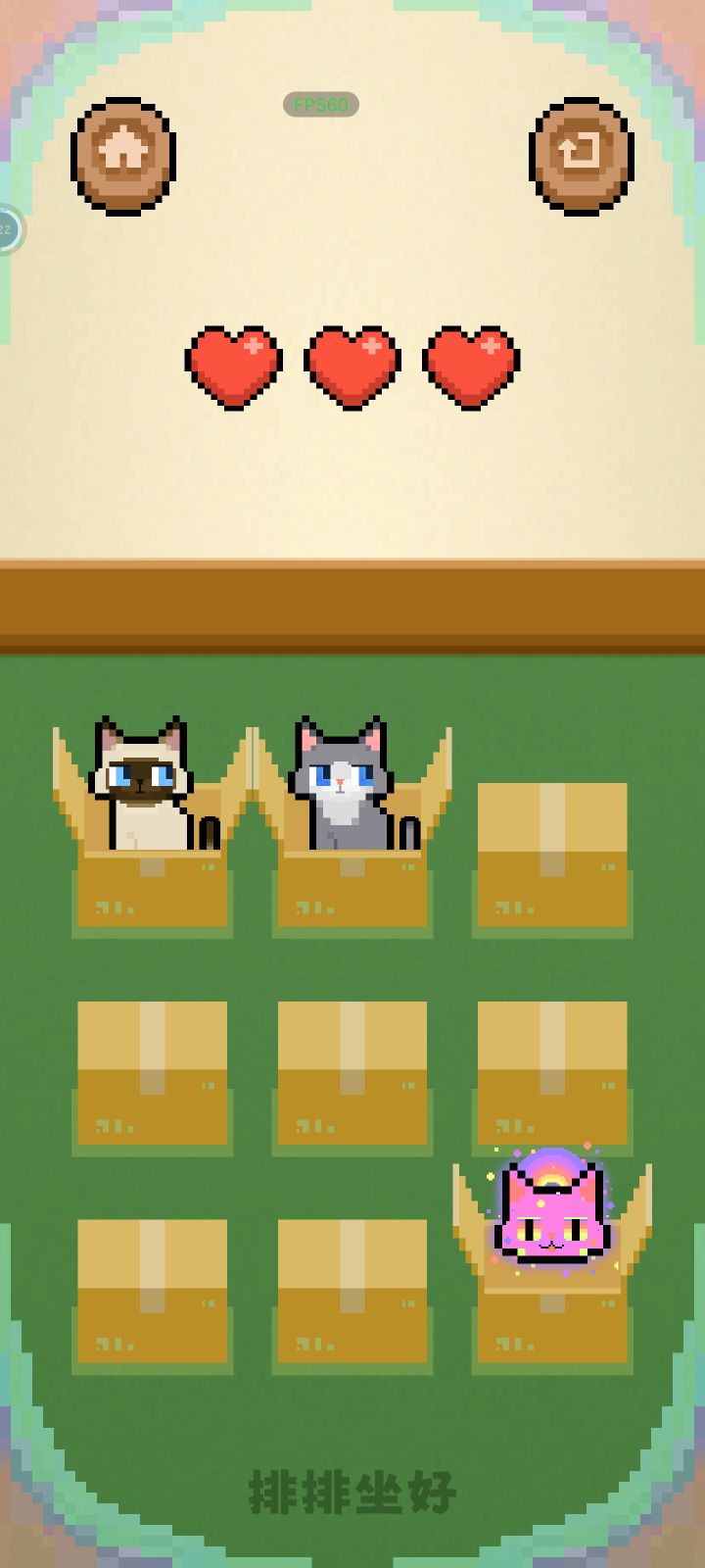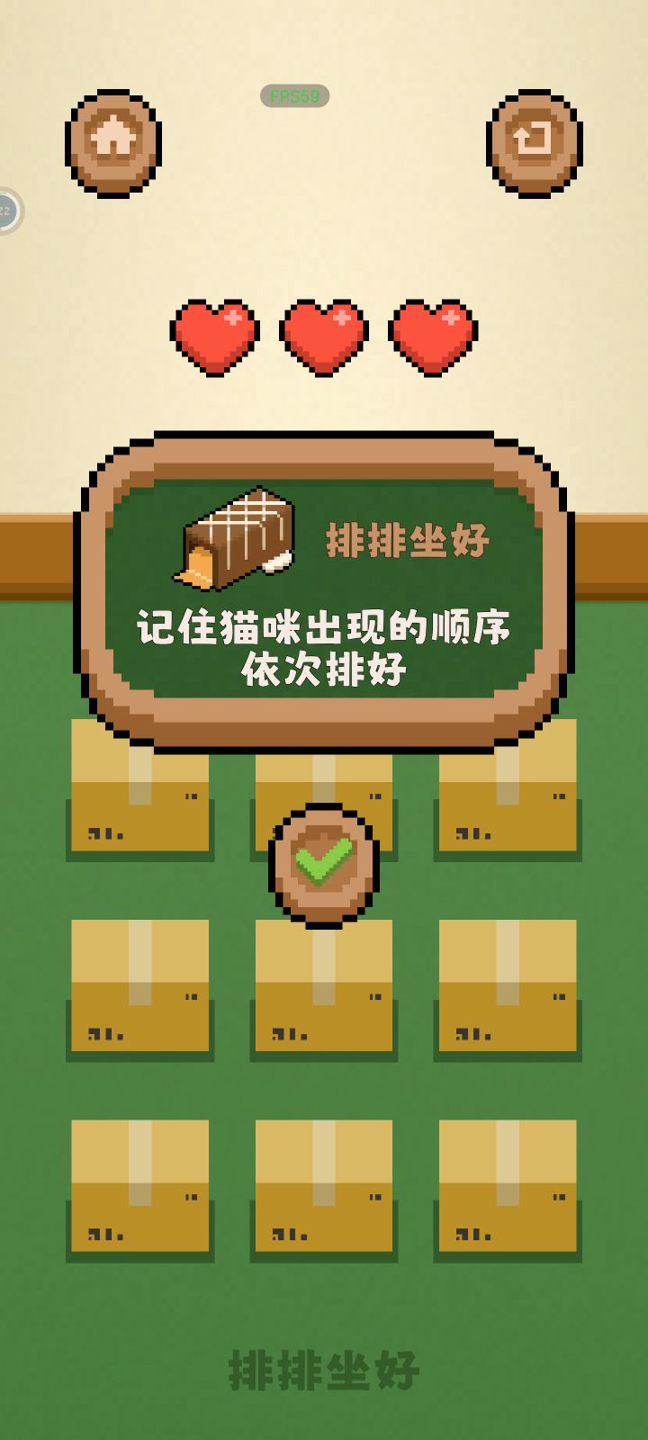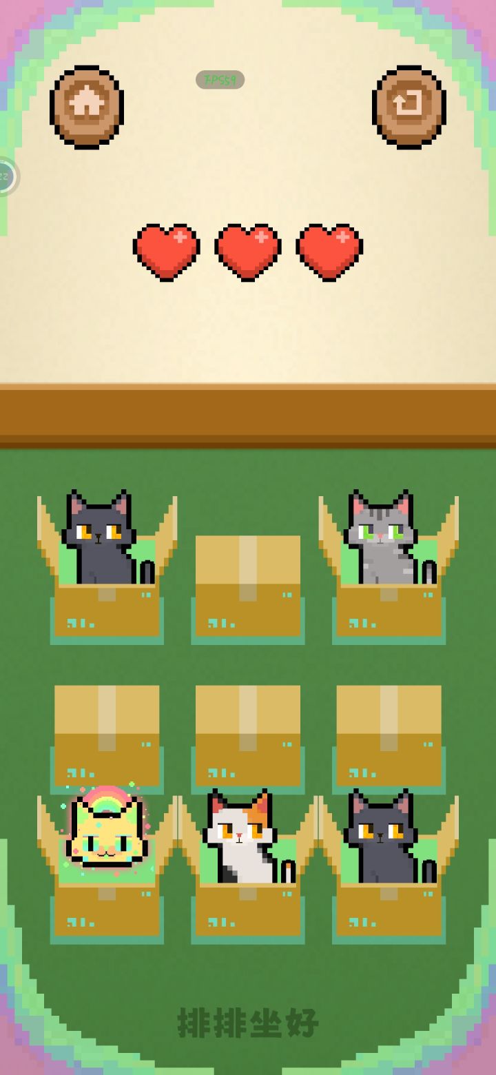 内容玩法上是三个连续闯关小游戏,分别是打地鼠+相同格子+排列,内容都是不变的箱子猫,然后完成对应操作即可。