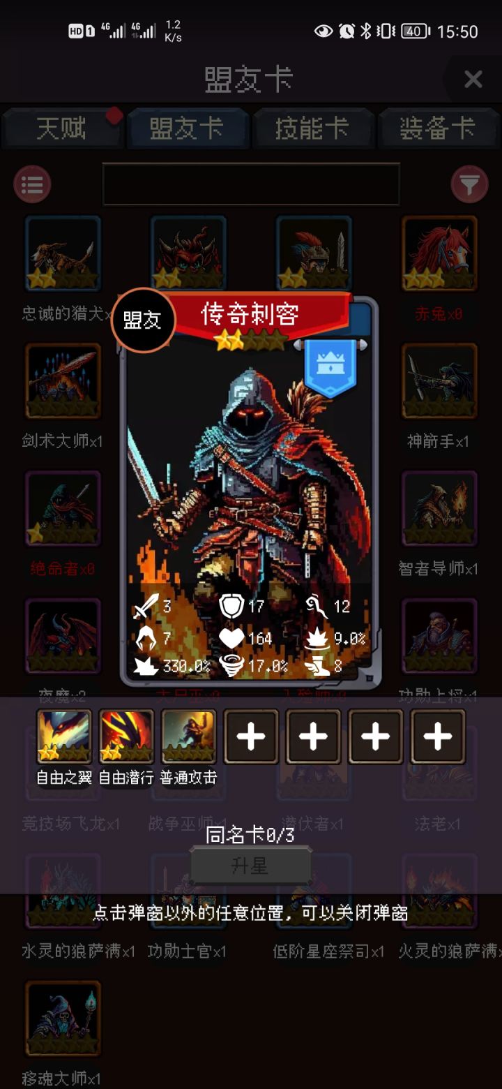很多攻略中提到盟友传奇刺客和剑雷征技能组合的优先级较高,一开始很不理解,在亲身体验后,效果拔群,尝试解答一下上面的问题:首先,介绍盟友【传奇刺客】(见下图)获得方法:永恒之刃故事包【分裂】主线完美结局【不灭的隐者】奖励*1。由于本主线卡声望,所以开局务必刷取天赋功成名就增加声望获取量。特点:暴击伤害非常高,达到320%(0星数据,满星340%,经评论区提示修改,感谢指正)。闪避率较高并能叠加