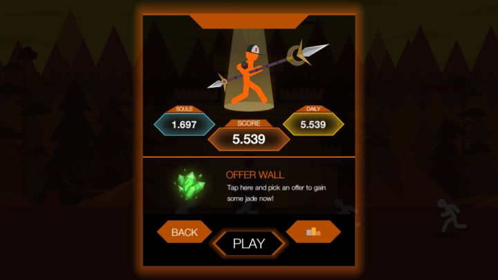先简单介绍下玩法,点击攻击。分左右两侧。小白人攻击一下就死大胖子连打两下刺客攻击一次后再反向攻击一次攻击范围可以看敌人脚下的黑点,变白说明进入你的攻击范围了。闪电型技能冷却结束会杀死当前屏幕内的敌人沙漏型技能冷却结束会进入时间缓慢状态武器界面左边第一个数值代表攻击范围第二个代表杀死敌人获得的金币下面两个是技能冷却速度。没有数字表示装备该武器时没有这个技能宝石,先上图从左到右分别