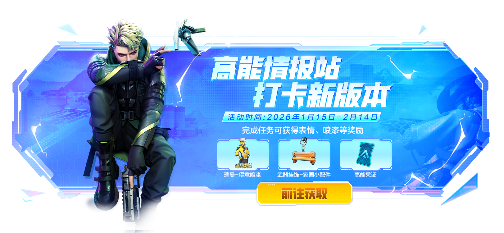 【前瞻导航】各位高能英雄请注意,新版本现已部署。为了帮助大家快速适应战场变化,“高能情报站”正式开放。一键了解版本新变化,领取打卡好礼。【活动说明】📅 活动时间:2026年1月15日 —— 2月14日【参与方式】活动期间,前往游戏内【事件】进入“高能情报站”,点击目录栏查阅新版本资讯,即可完成打卡任务。【活动奖励】在了解版本情报的同时,我们也为大家准备了一份日常补给:🎨 喷漆“瑞曼