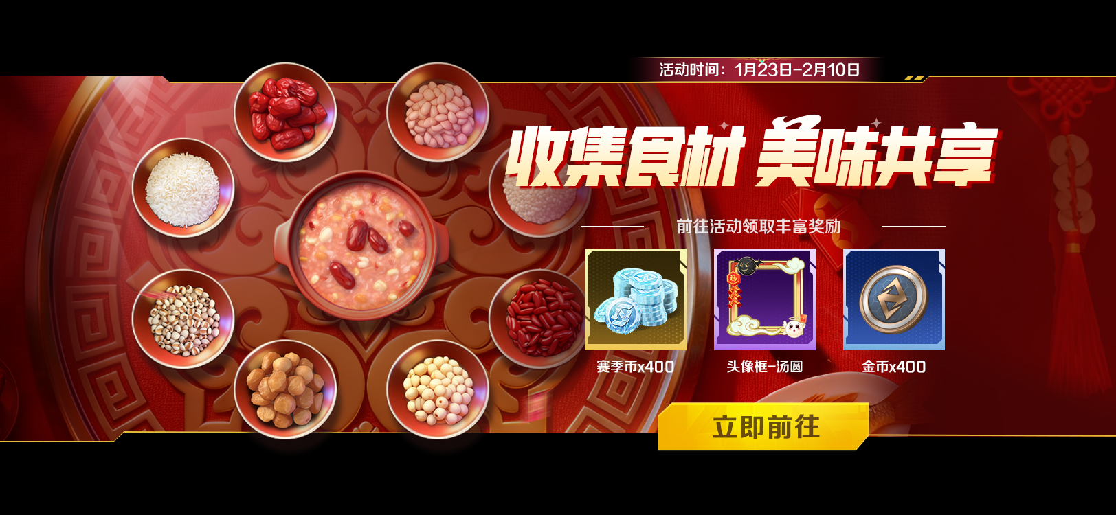 【冬日物资空投】S11赛季激战正酣,能爆基地为大家准备了一份特殊的“冬日能量补给”!⚡️在战场上搜集食材,制作暖心美食,不仅能恢复状态,还能获得排位双倍上分BUFF!【活动情报】📅 活动时间:1月23日 - 2月10日📍 参与方式:游戏内事件 - 【收集食材 美味共享】【行动指南】战场搜寻:游玩经典模式,拾取地面刷新的“食材礼包”并带出局外。物资合成:开启礼包随机获得食材(大米、红