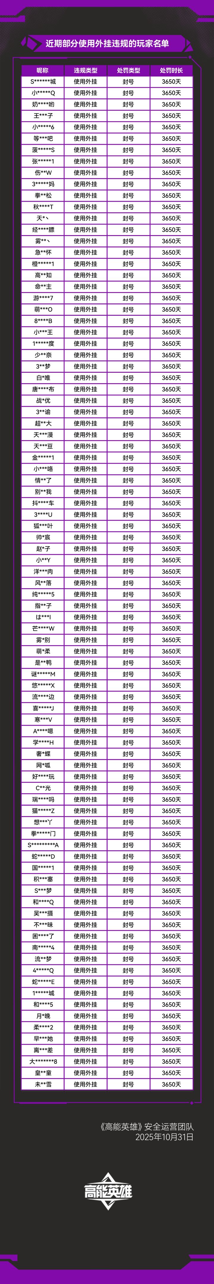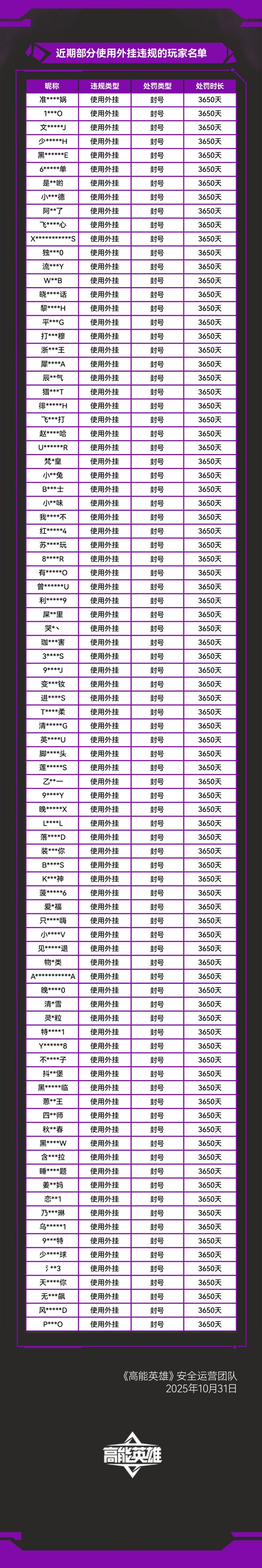 《高能英雄》外挂作弊处罚公告(10月31日)