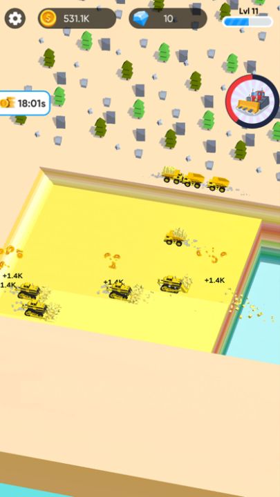 一起进入挖掘的世界!在游戏内解锁各式的挖掘机和装载机,在土地上开采原材料,并将其运送到装载机上,用于建造道路,大楼和基础设施,不断扩张城市,升级挖掘机的效率和数量,建造一个完整的城市!