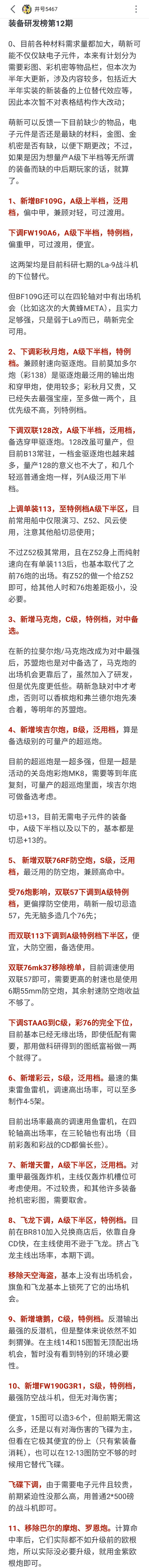 总不会有人实现金菜自由了吧?[表情_微笑]金菜不够的老东西和萌新建议参考最新装备榜,不要强化到错误的装备,最终追悔莫及。以下是原文,希望能对大伙有所帮助哈[表情_开心] 金部件榜第12期1、舰载机部分。1.1、受到br810和旗鱼的严重挤压,移除彩飞龙在斟酌类S的位置。彩飞龙在需要防空的环境,和br810互为调速选择;而大世界和低耗等只需要预装填/平行雷伤害的环境,只要不需要防空,就被(哪怕是+1