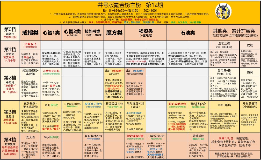 这轮礼包有点多,需要看下氪金榜,特别萌新和穷指,了解具体性价比[表情_开心] 以下是原文(超长),希望能对大伙有所帮助哈(也可只看图图)[表情_微笑] 第13期更新 0、再次强调,氪金榜的档位意思为: 第一档玩家:双倍钻氪不完的玩家,均为第一档玩家:除非经常钻买魔方、石油、心智等物资,否则基本不考虑第一档以外的内容,优先考虑氪完双倍; 第二档玩家:双倍钻氪完,但单倍钻氪的较少的玩家:此时比起单倍钻