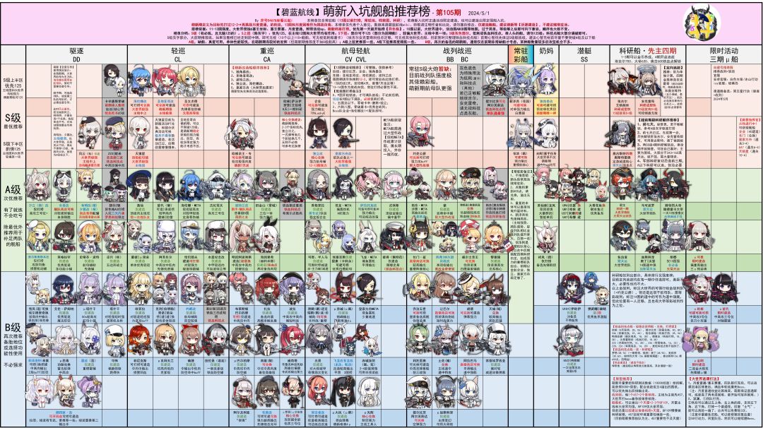 本期改动内容较多,涉及框架部分微调,25年新春活动舰船和樊笼内的神光活动舰船。 1、主线榜先锋顶端部分微调。目前调整成为五个SS级和一个S+级的模式。本期特别备注六个15图顶级先锋的选择倾向和优势场合。 Z52:六边形战士,中规中矩;在配置高/只抄作业时会更优先,尤其是保武藏强。 拉菲II:比较吃配合,有瑞凤/埃尔德里奇等时优先考虑。 埃尔德里奇:低配时更优先,在其他队友中SS较少时带普通船强,保
