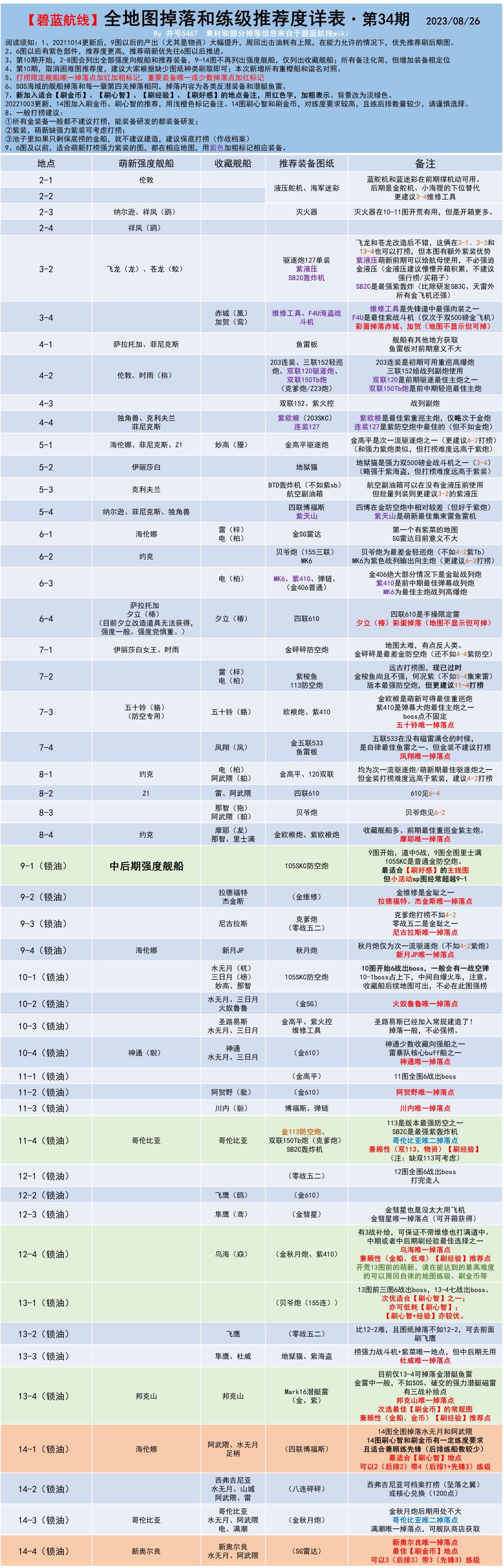 最新井号打捞表(源于b站井号5467) 第34期改动1、作战档案新增【峡湾间的反击】。SP3可掉落金四磁,但是无锁油,且金四磁已经加入装备研发系统。目前整体来说,研发比硬捞金四磁更划算一些。不再额外推荐大家硬捞,打完走即可。2、主线表部分,移除SOS海域相关描述。之前每周任务增加了潜艇类装备的获取,移除了SOS海域。同时也移除SOS海域相关描述。