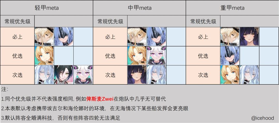 本期改动内容较多,涉及框架部分微调,25年新春活动舰船和樊笼内的神光活动舰船。 1、主线榜先锋顶端部分微调。目前调整成为五个SS级和一个S+级的模式。本期特别备注六个15图顶级先锋的选择倾向和优势场合。 Z52:六边形战士,中规中矩;在配置高/只抄作业时会更优先,尤其是保武藏强。 拉菲II:比较吃配合,有瑞凤/埃尔德里奇等时优先考虑。 埃尔德里奇:低配时更优先,在其他队友中SS较少时带普通船强,保