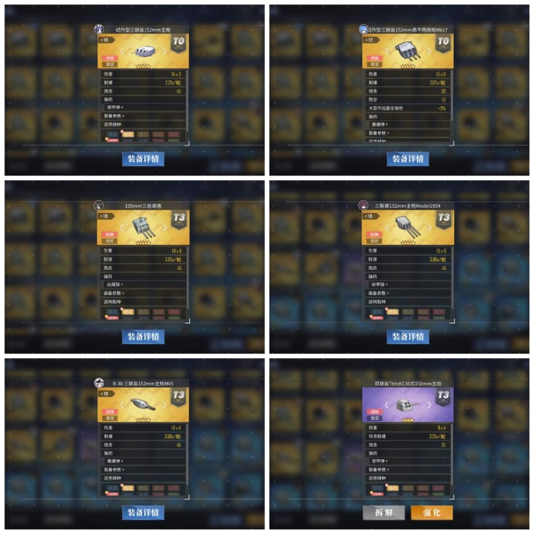 中型舰炮分为轻巡炮和重巡炮,首先我们来讲轻巡炮。 轻巡和驱逐一样分为炮巡和雷巡,炮巡你就给她装好的轻巡炮,雷巡你就凑合给她配一下,配个好的鱼雷。舰娘我就不讲了,是炮巡还是雷巡可以自己查,下面介绍的就是版本顶尖的轻巡炮了。 试做型三联装152mm主炮(海星炮,通过1期科研获得图纸合成获得) 试做型三联装152mm高平两用炮(铁屁股炮,西雅图炮,通过2期科研获得) 三联装152mm主炮(活动获得,新出