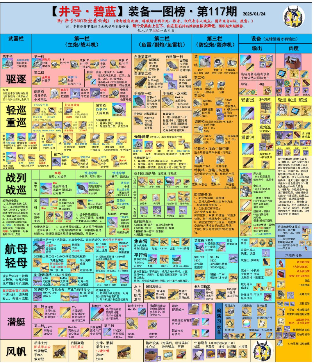 本期改动内容较多,涉及框架部分微调,25年新春活动舰船和樊笼内的神光活动舰船。 1、主线榜先锋顶端部分微调。目前调整成为五个SS级和一个S+级的模式。本期特别备注六个15图顶级先锋的选择倾向和优势场合。 Z52:六边形战士,中规中矩;在配置高/只抄作业时会更优先,尤其是保武藏强。 拉菲II:比较吃配合,有瑞凤/埃尔德里奇等时优先考虑。 埃尔德里奇:低配时更优先,在其他队友中SS较少时带普通船强,保
