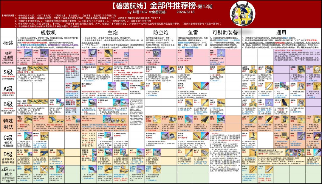 总不会有人实现金菜自由了吧?[表情_微笑]金菜不够的老东西和萌新建议参考最新装备榜,不要强化到错误的装备,最终追悔莫及。以下是原文,希望能对大伙有所帮助哈[表情_开心] 金部件榜第12期1、舰载机部分。1.1、受到br810和旗鱼的严重挤压,移除彩飞龙在斟酌类S的位置。彩飞龙在需要防空的环境,和br810互为调速选择;而大世界和低耗等只需要预装填/平行雷伤害的环境,只要不需要防空,就被(哪怕是+1
