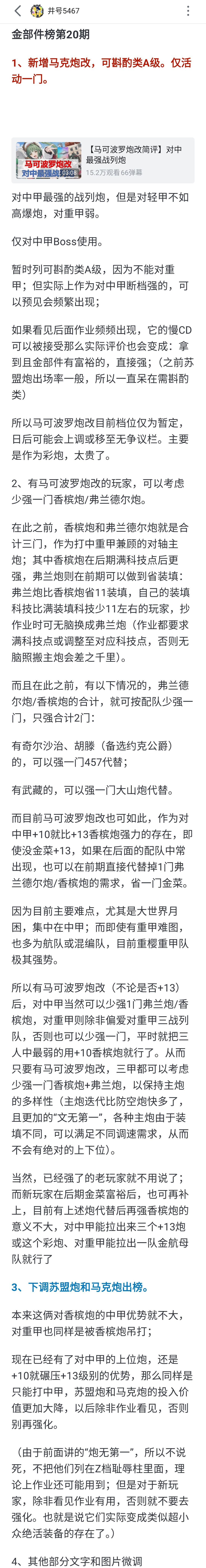 最近这一个彩大活,又多了不少萌新,给大伙搬个最新装备强化榜,让大伙强化不吃亏不上当。希望对大伙有所帮助哈[表情_开心] 以下是原文 1、旗鱼暂不上榜,继续观望。目前除了共斗有出场,其他环境及高难均还用不上。 2、 苏盟炮,合并在常规主炮S级后,和第三门香槟炮、弗兰炮、出云炮合并。如果前述炮还没强化合计3个的,可以无脑强化,当做第三个20S轴炮。 对于已经有3个上述20S轴穿甲炮的玩家,苏盟炮,新增