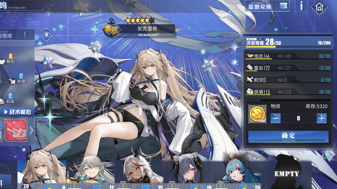 昨天下水君主在用物资追赶,今天下水了安宝用完图纸直接升到了28,差一点拉满。[表情_泪目] 下一个科研直接大帝 md,亏我为了凑点数把仅剩的4个金布里花完,结果下冷却时间还在,关键还一直给我科研标红点,消都消不掉。 凑科技点主要就靠拿新船(商店换,作战档案捞)和突破。(我经验书多,直接喂到70级然后用布里就好)有强力角色当然可以拉到120,但是花的时间会较久。 下一步无非是凑埃吉尔的点数,慢慢来。