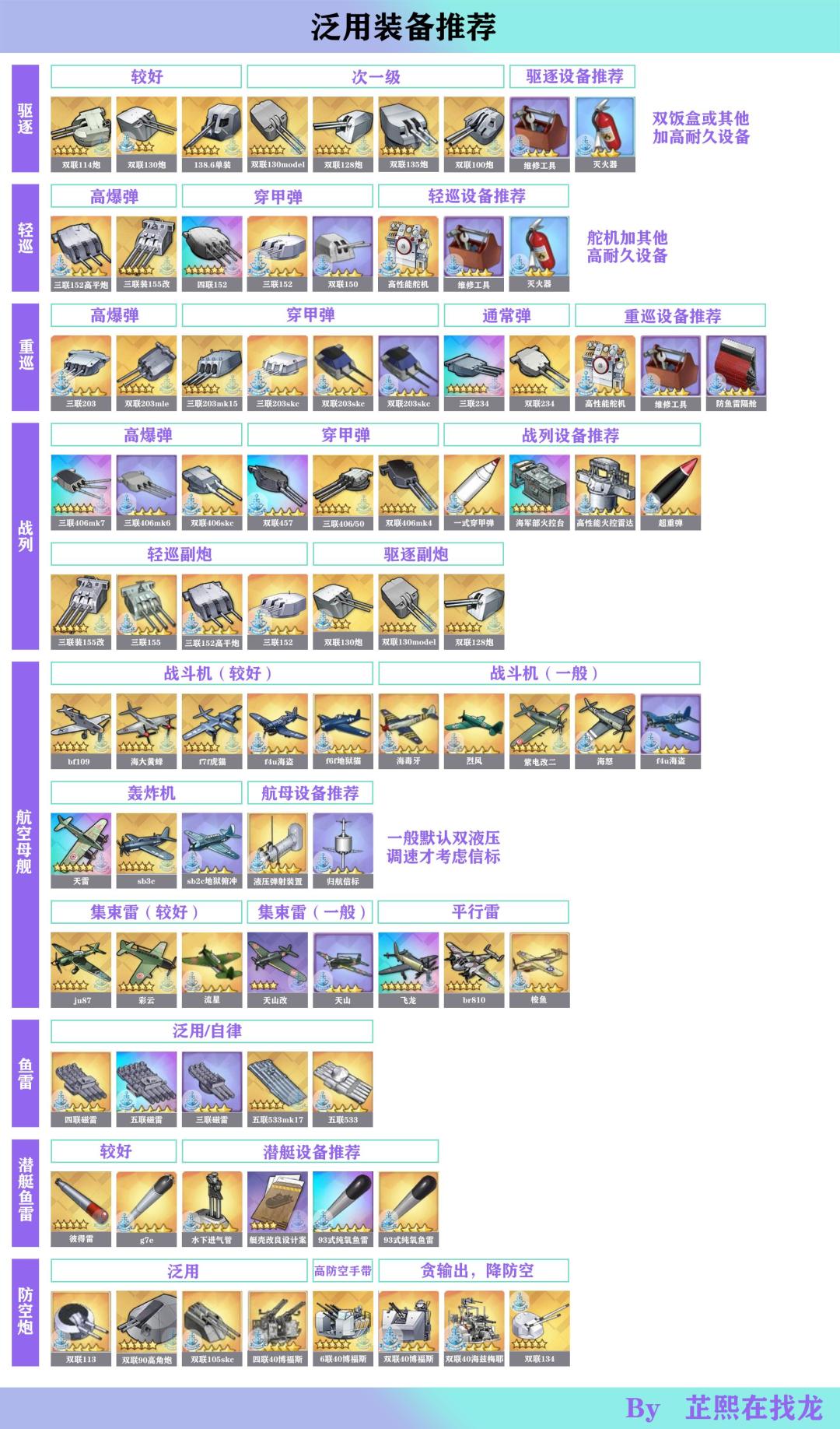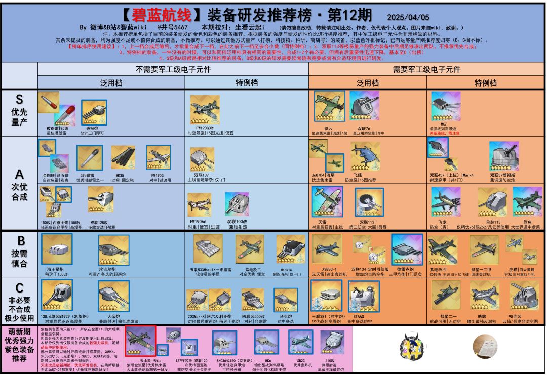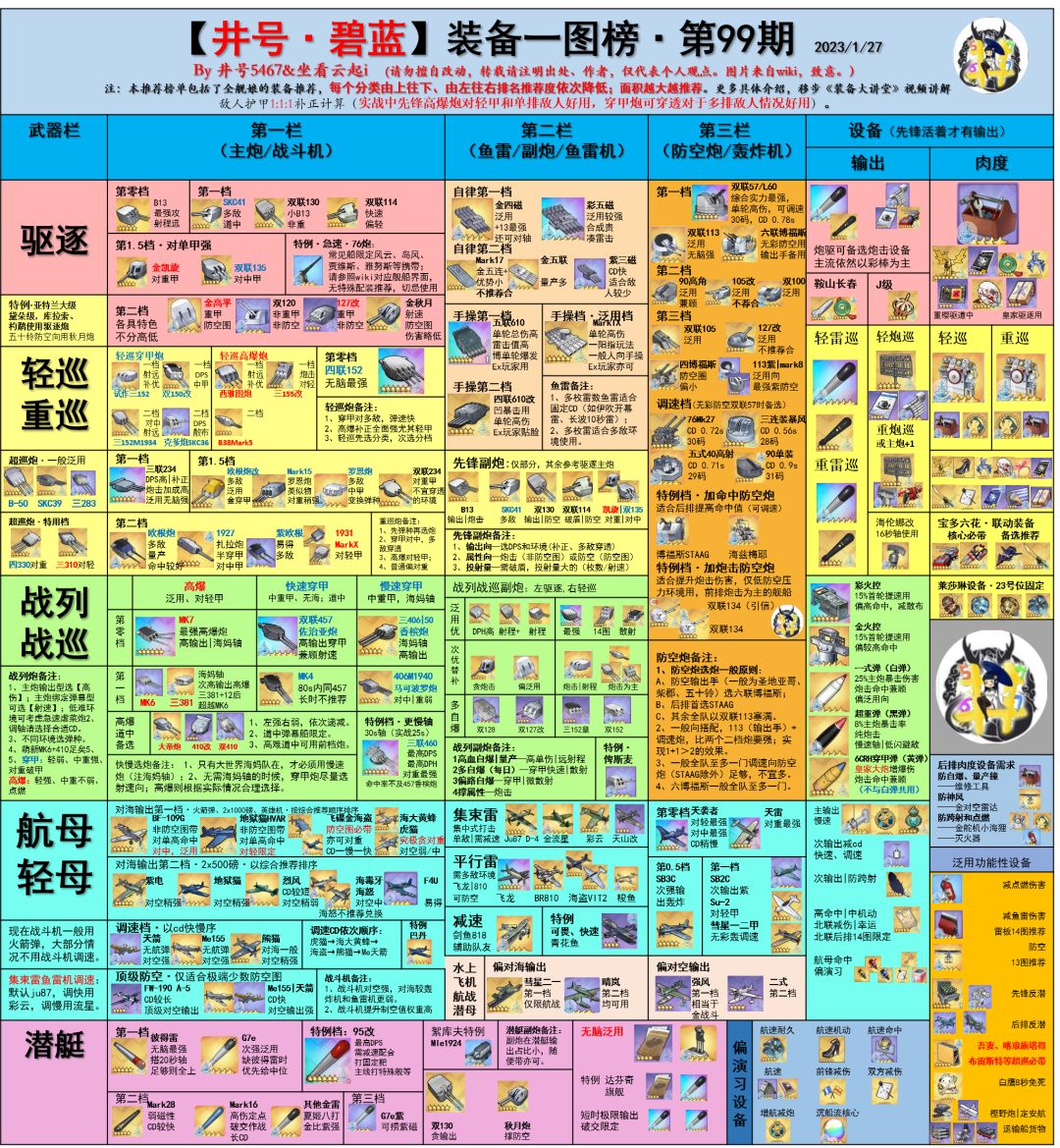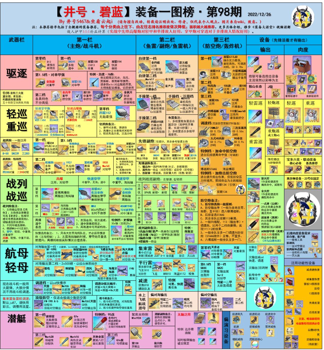 最近有新服庆典活动,又到了每年最适合自建萌新入坑的时候了[表情_开心]咱们这的装备甚是复杂,所以建议萌新粗浅了解一下最新的萌新装备榜。源于b站井号5467,希望能对萌新(老东西还用看这个?)有所帮助[表情_微笑](篇幅较长,可以直接参考大图) 萌新装备榜第13期 0、今年一月研发新装备,对萌新基本无用。 无论是又贵还不如飞碟的紫电改四,或者彩装旗鱼依然主线不如飞龙且大世界不如集束雷; 博美炮对于萌