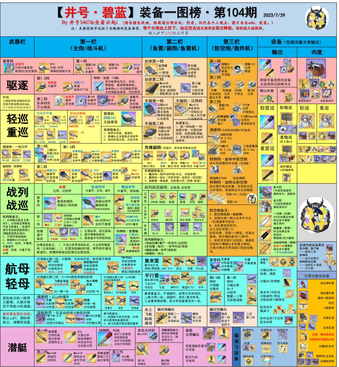 整合了一下大多数舰船类型的装备推荐,去掉了一些优先级一般的装备。 一些装备的研发优先度不高,缺少材料的玩家谨慎选择。 一些成就或活动获取的装备如白鹰损管,纳尔逊的旗语,开拓者奖章,天使之羽等大概率只会有一件的设备没有列出,并不代表这些设备不强。 排版可能不是很好,凑合着看吧。(22年11月9日更新) 上图可以适用于大多数舰船。但一些舰船由于技能的原因,在准备选择上需要搭配一些特殊的装备来契合技能 7