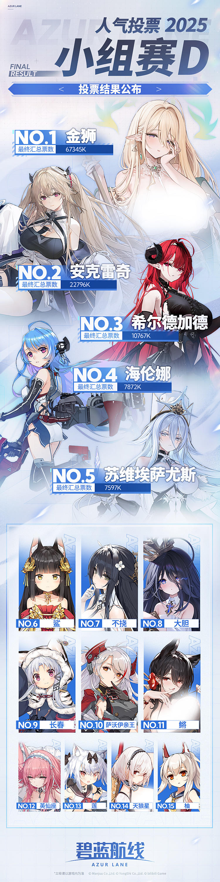 大的来了家人们!近日碧蓝航线2025人气投票小组赛D组结果正式公布了。立马引发玩家热议!金狮的票数夸张到除她之外前十角色的票数总和还多,玩家都调侃狮在游戏主线大世界里战力拉满,金狮在投票里也能以一抵十,人气太能打了。 金狮以6亿7000多万的票数断层第一,第二名安克雷奇的票数才刚够她的三分之一,玩家嘴上喊着安宝最可爱,手上却诚实把票投给了金狮,好家伙 说一套做一套。 这次投票前五的金狮、安