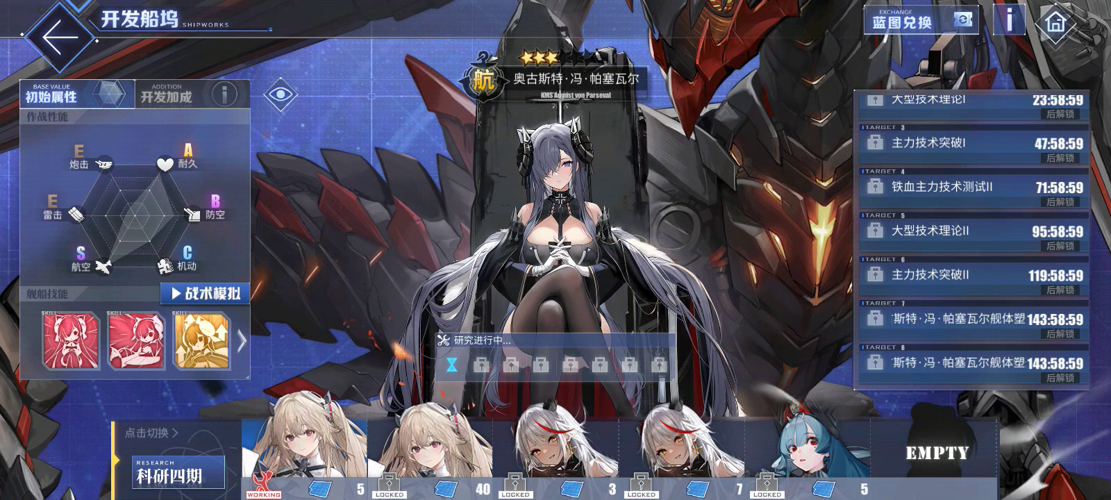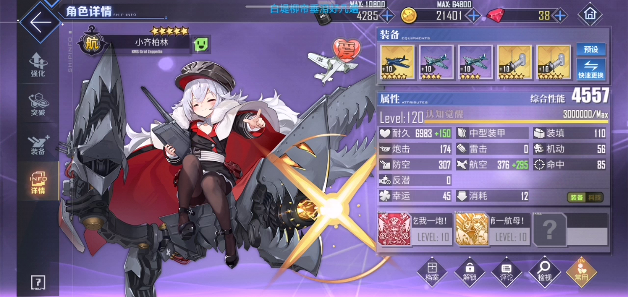再被健康系统制裁后,创的新号,小齐柏林是这个新号上第一个抽出来的紫皮航母,在去年后半年开启了肝德系科研路程,拿这一艘船把大帝,埃及尔,奥丁肝出来了,真就一点点的肝,这船强度还不太高😵, 年底的胡腾20发出了,然后这期池子卡紫了😧,淦。 纪念一下,等下次就把你婚了。