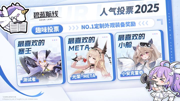 #碧蓝航线 #azurlane人气投票2025 >>AZUR LANE人气投票2025<< 趣味投票NO.1定制外观装备登场!☆ 最喜欢的塞壬 NO.1——测试者☆ 最喜欢的META NO.1——光荣·META☆ 最喜欢的小船 NO.1——小安克雷奇活动时间:4月9日维护后~5月7日维护※活动期间,可领取以「AZUR LANE人气投票2025」趣味投票NO.1角色为主题分别制作的特殊