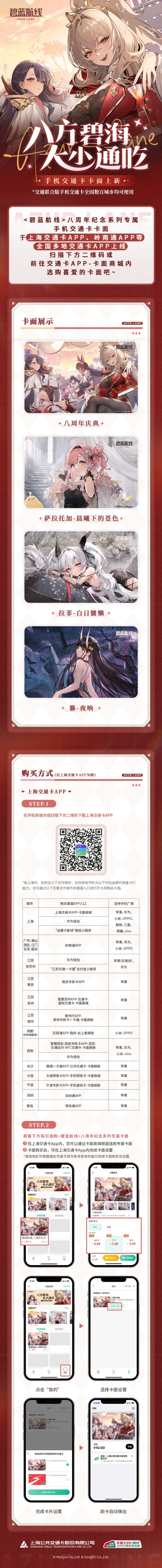#碧蓝航线 #碧蓝航线8周年 《碧蓝航线》× 上海交通卡 联名手机交通卡上线!8周年纪念系列手机交通卡卡面已正式上架上海交通卡、岭南通等全国多地交通卡APP。碧海同航的约定正乘着缱绻的微风,向指挥官发出邀请~※交通联合版手机交通卡全国330+城市公交地铁通用※深圳通APP内的卡面将于2025年5月19日上架另外,本次联名后续还将推出安克雷奇毛绒异形卡/标准卡,预计于6月10日开启预售