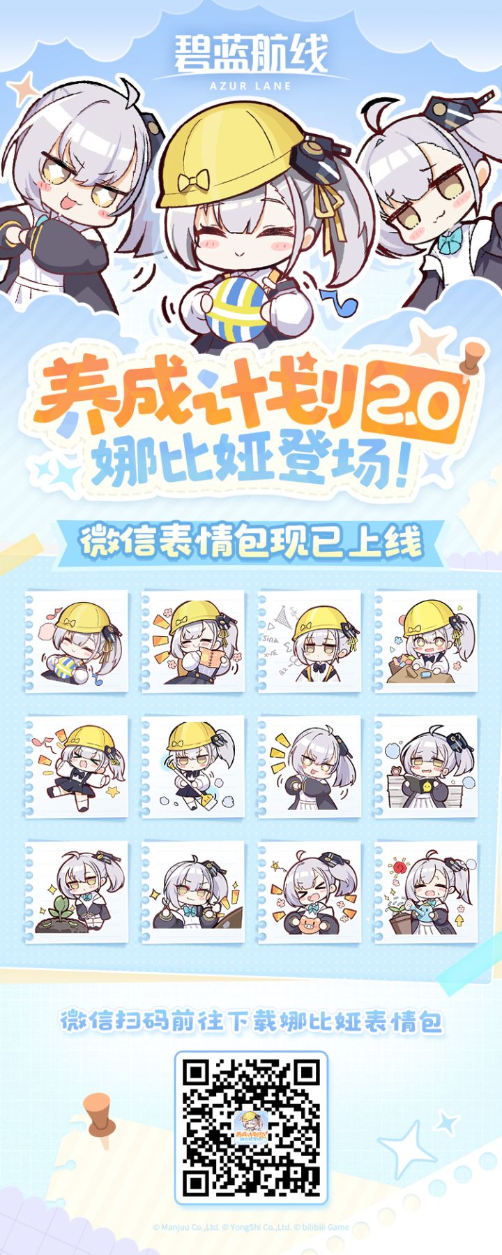 ◆养成计划表情包◆相伴成长的故事里,又有哪些值得纪念的点滴?小加加将这些瞬间一一制作成表情,指挥官快来使用吧!「碧蓝航线养成计划」表情包,现已上架微信!指挥官在处理日常消息的时候,可爱的娜比娅也想要陪伴在你的身边!(′▽`〃)〓获取攻略〓微信扫描下方二维码或前往官方微信公众号【碧蓝航线手游】→点击聊天框下方菜单栏内的【港区补给】→选择【表情包下载】→【碧蓝航线养成计划】表情包