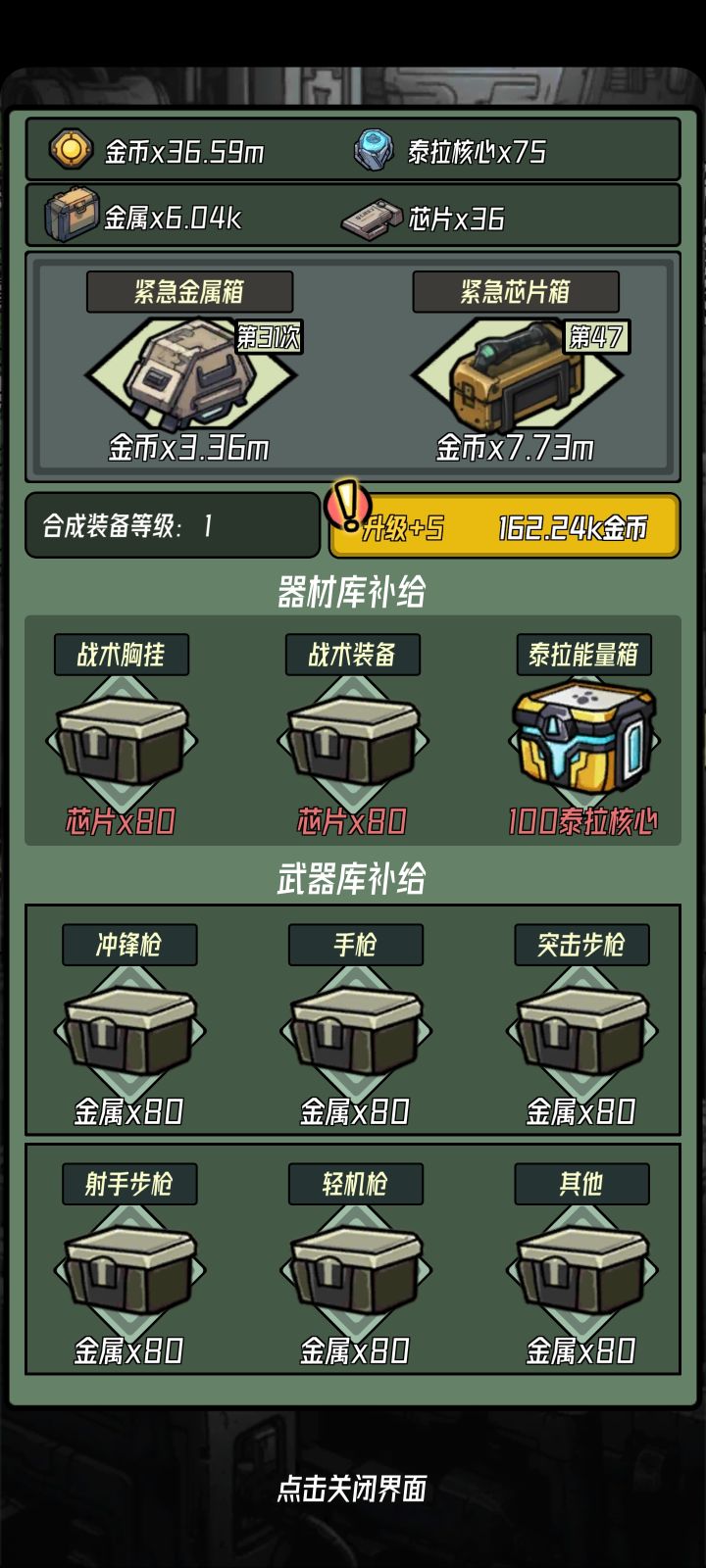 昨晚11点左右下载,到现在也有半天多了,分享一下自己的玩法。狗员配置主力输出,rpg+空中支援,必须是rpg,因为超高的能量加成,加上空中支援几乎是无缝的aoe,不了解的可以自己去体验下控制,手枪+emp其余轻机枪,冲锋枪等带控制且单体伤害高的用于打boss,基本都是给大哥打下手打法钱全部拿去升级合成装备等级,边角料才拿去升级金属和芯片产量。合成等级上去了人手合成一把武器和护甲就行,之