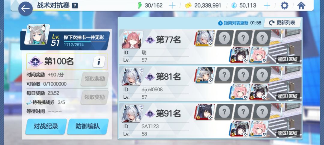 玩国服本意只想解锁白子动态立绘来着,想不到侥幸能冲到这个位置,发帖纪念一下。因为估计之后很难冲到这么高的位置了,应该马上就要被后面的大神打下来了hhh 想想还是很激动的,毕竟第一次在游戏里冲到这么高的位置。 附一张配队截图(我战斗编队和防御编队一样),浅浅的说一下配队思路,毕竟大佬们讲解的更加深刻: 1.注意配队顺序影响初始位置,从左到右的编队在图内战斗时站位会变成从右到左。 2.打竞技场(战术对