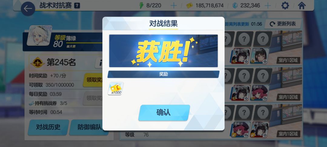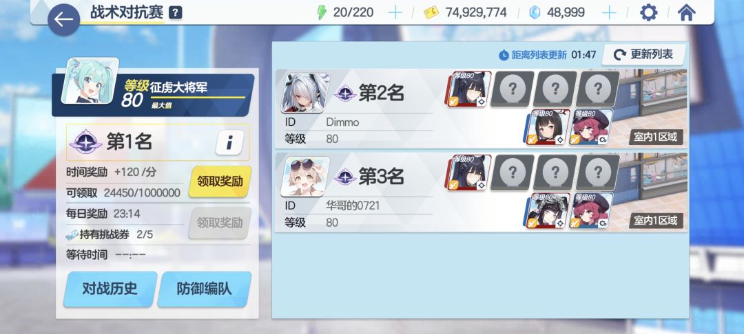 现在游戏都不知道去什么论坛好,索性在tap留下记录了。 基本跟第一张图的人互锤(脸熟多),第二张偶尔碰上(少见)。第三张索性看自己感觉截图了,有的就没录了。(不知道能不能论坛碰到同场人哈) 抽到保洁(真理奈)后,这次竞技场就经常吃第一奖励。 阵容(保洁,大瞬,伊织,邮箱。普通真白,168) 楼上的哥们阵容邪门,我伊织要干掉邮箱才有机会赢。不然我没续航,他邮箱活着我打不过。 这赛季虽然伊织被保洁红甲