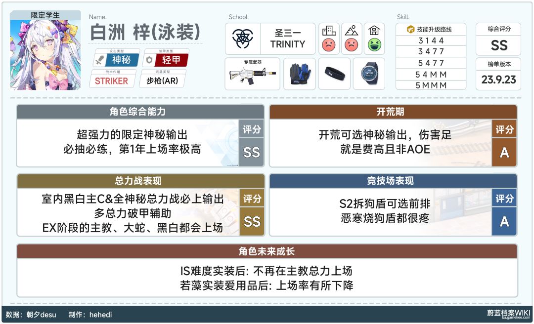 大家好这里给大家带来2023/10/12 ~ 2023/10/26蔚蓝档案国服将开启小春、日富美的卡池的角色简评,以及后续会出的泳装1期卡池角色简评,希望对大家抽取抉择上有所帮助~ 全角色细评增加以下角色的评价: 梓 综合S 开荒A 总力SS 竞技B 小春 综合SS 开荒SS 总力SS 竞技B 花子 综合B 开荒B 总力A 竞技A 泳装日富美 综合C 开荒C 总力B 竞技D 泳装梓 综合SS 开荒