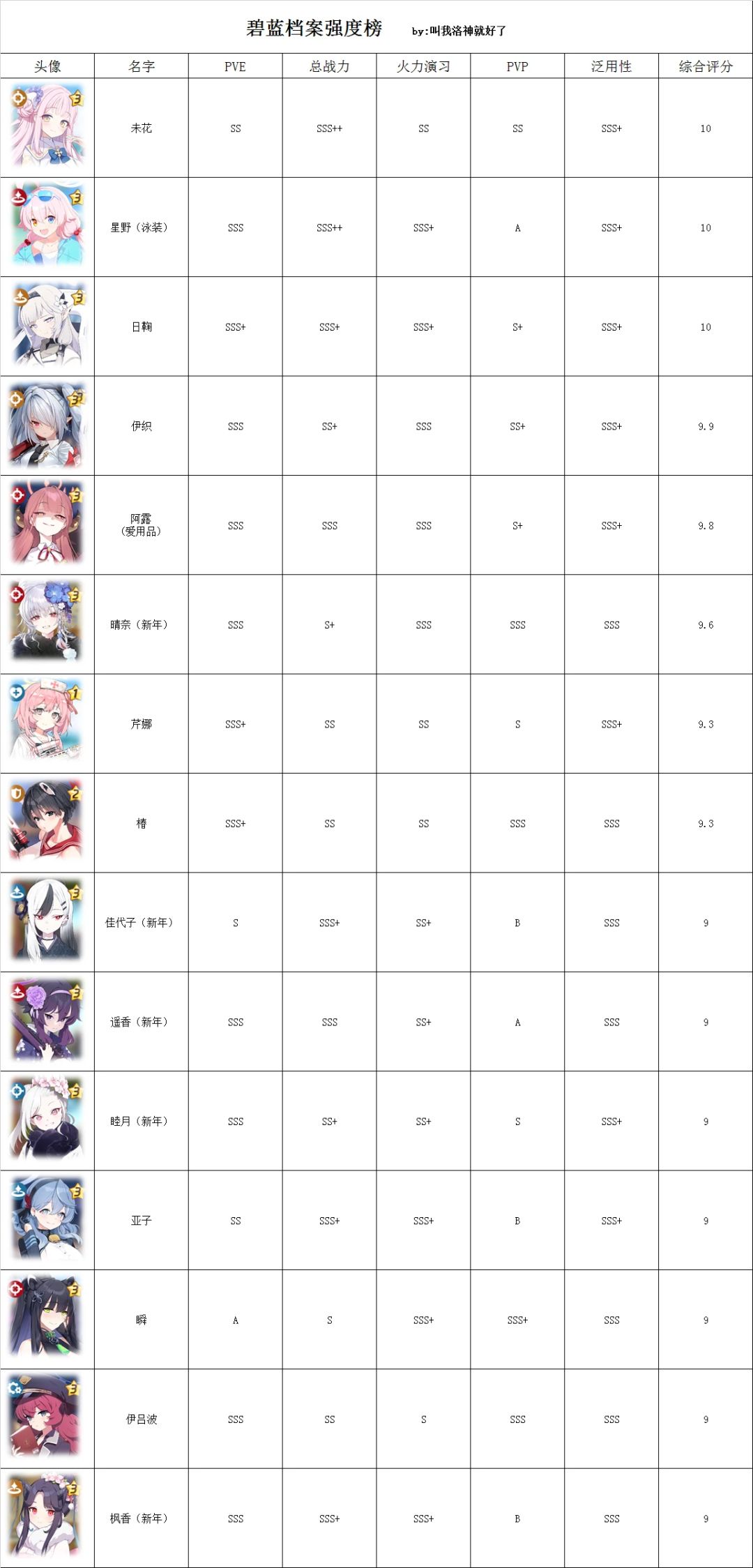 蔚蓝档案角色强度榜+全角色技能升级推荐表 本文来自阿 b 大佬: 本文仅为自己保存等游戏上线使用,不会参加任何活动。 加入新角色:爱丽丝(女仆)、柚子(女仆)、时(兔女郎) 第四批爱用品实装角色的强度调整:日奈(泳装)、日富美(泳装)、艾米、泉 原综合强度栏修改为综合评分 增加PVE栏 综合评分说明: 9-10分的都是强度非常高的角色,必练 8-8.9分的都是好用高泛用性的角色,基本上也是有就要练