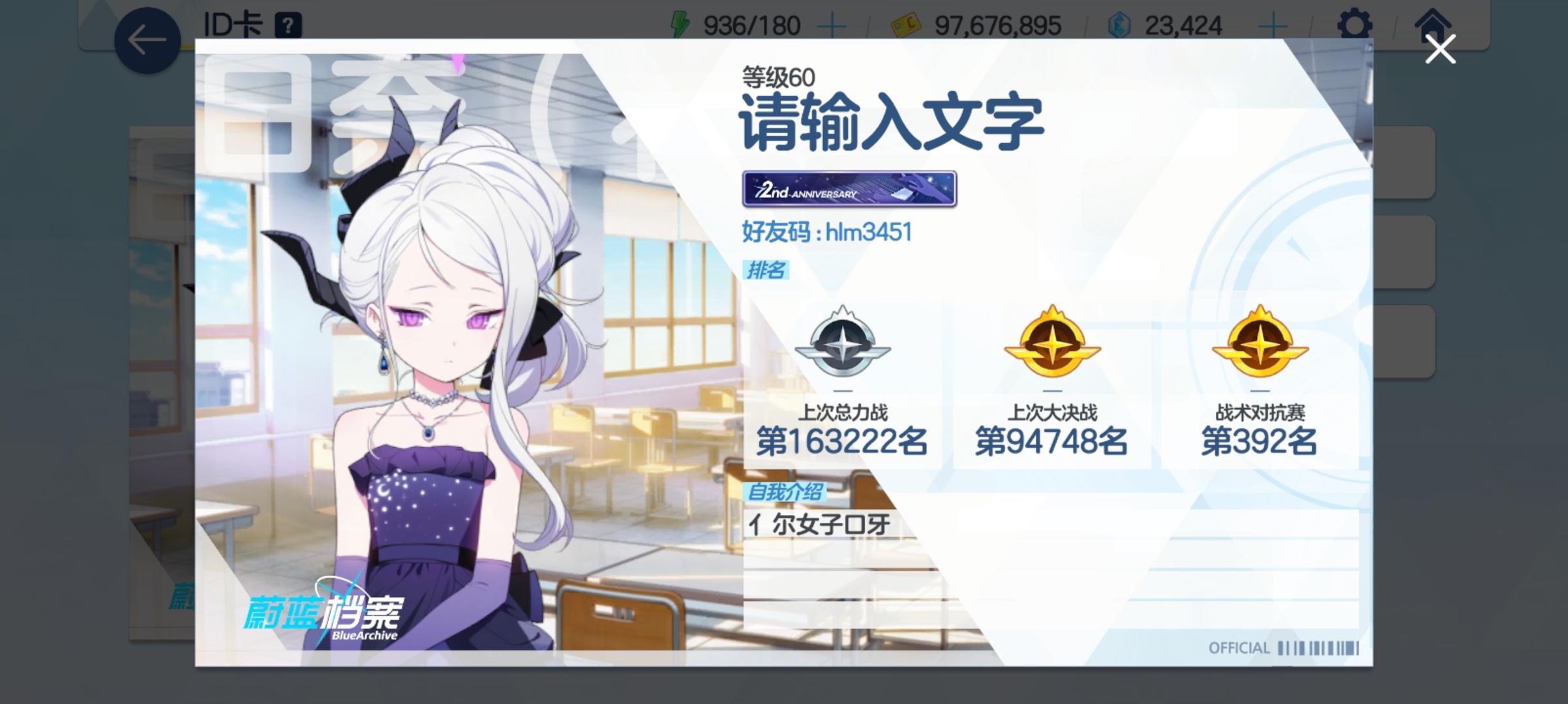 其实很早就结算了,只是我懒现在才登💀好像也没啥好纪念的,感觉并不卷🤔还有由于我太FW,EX及以上我打不过,所以一直在HD死凹(乐)好友码:hlm3451 欢迎来找我玩😄二改:bro以为加好友是搜UID,改掉了💀#蔚蓝档案