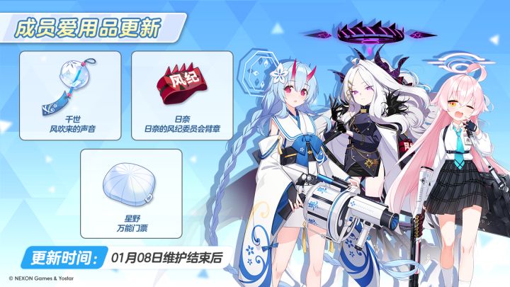 01月08日版本更新后,将新增成员“日奈”、“星野”、“千世”的爱用品,通过爱用品可以使对应成员获得属性增加、基础技能提升等加成各种效果,同时还将解锁全新的成员专属好感剧情。■ 爱用品解锁条件成员的好感等级达到15后,可解锁爱用品■ 爱用品进阶成员的好感等级达到20后,消耗一定量的信用积分、神秘古物素材和特定的礼物,可将爱用品从T1提升至 ➟ T2■ 爱用品效果日奈• 属性提升(T1