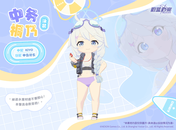 //////////档案启封//////////■ 桐乃(泳装)瓦尔基丽警员学院生活安全局的热血警员学员。这次是救生员模式。对任务充满干劲但实力尚有不足。尽管如此仍认真对待工作,为履行救生员职责不遗余力。“正在执行救生员任务!”#蔚蓝档案