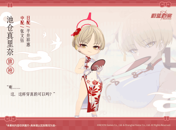 //////////档案启封//////////■ 真里奈(旗袍)为迎接与山海经的交流会而换上旗袍的真里奈。她狂热地迷恋熊猫、欣然接受山海经的款待,正尽情享受着交流会原本的乐趣。虽然这身与红冬风格截然不同的装扮让她本人有些局促,但周围人的评价似乎大不相同。“呃……这,这样穿真的可以吗?”#蔚蓝档案