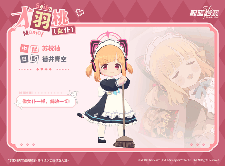 //////////档案启封//////////■ 桃(女仆)千禧年游戏开发部的编剧。穿上女仆装意外被误认成C&C成员。没等误会解除,就接连被卷入一件又一件的事件中……不过性格乐天的她,总能知道如何突破难关。"终极女仆,闪亮登场!老师——现在就开始游戏吧!"#蔚蓝档案
