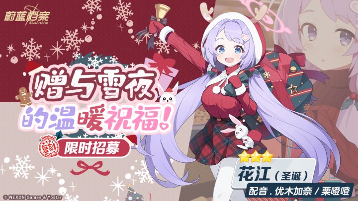 限时复刻招募活动即将开启,请老师不要错过哦!■ 招募时间08月14日 维护后 ~ 08月21日 13:59■ 招募内容 • 限时复刻招募【赠与雪夜的温暖祝福!】在本次招募中,3★成员“花江(圣诞)”的招募概率得到提升!• 限时复刻招募【响彻圣夜的慈爱颂歌】在本次招募中,3★成员“芹娜(圣诞)”的招募概率得到提升!※ 具体成员信息和概率信息可以前往游戏内招募界面查看。#蔚蓝档案