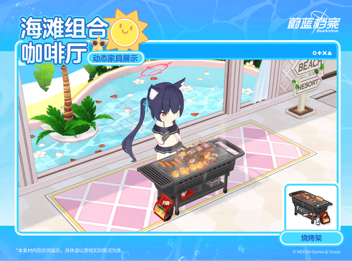 全新成员&家具互动动作即将更新!在咖啡厅配置“可互动的家具”后,当特定成员来访时,就会与家具产生交互动作!■ 更新时间12月04日 维护结束后■ 互动更新• 芹香(泳装)&烧烤架能烤多种食材的烧烤架。使用时请注意安全。烤肉~烤蔬菜~还有美味的调料~和大家一起度过悠闲的烧烤时间吧!#蔚蓝档案